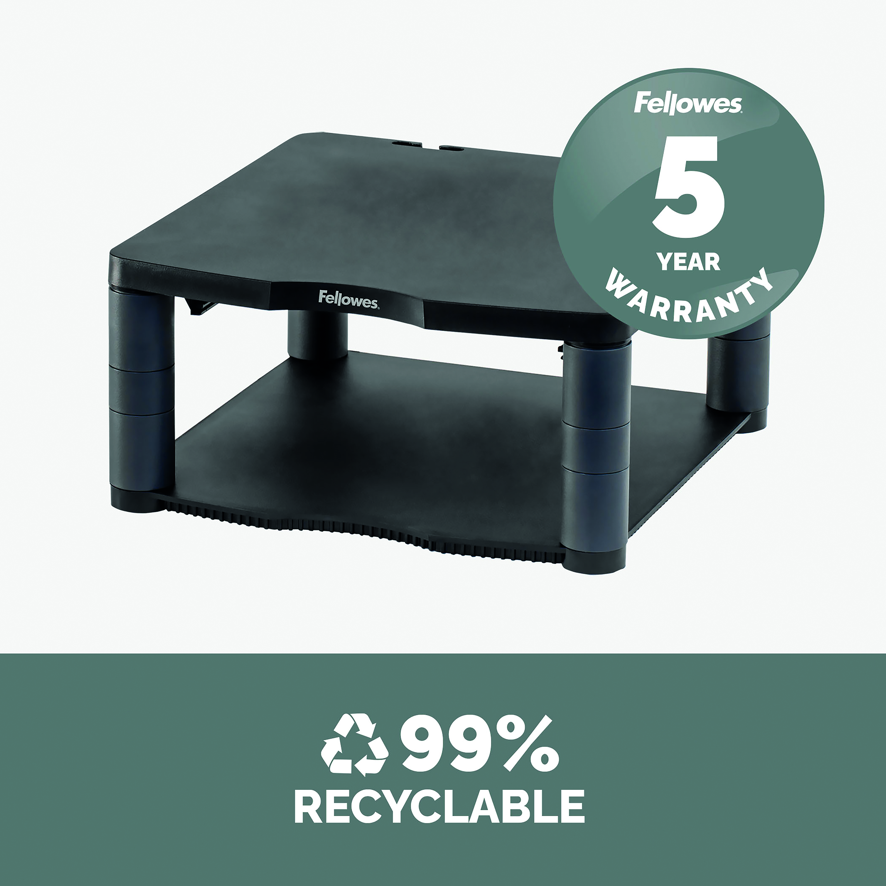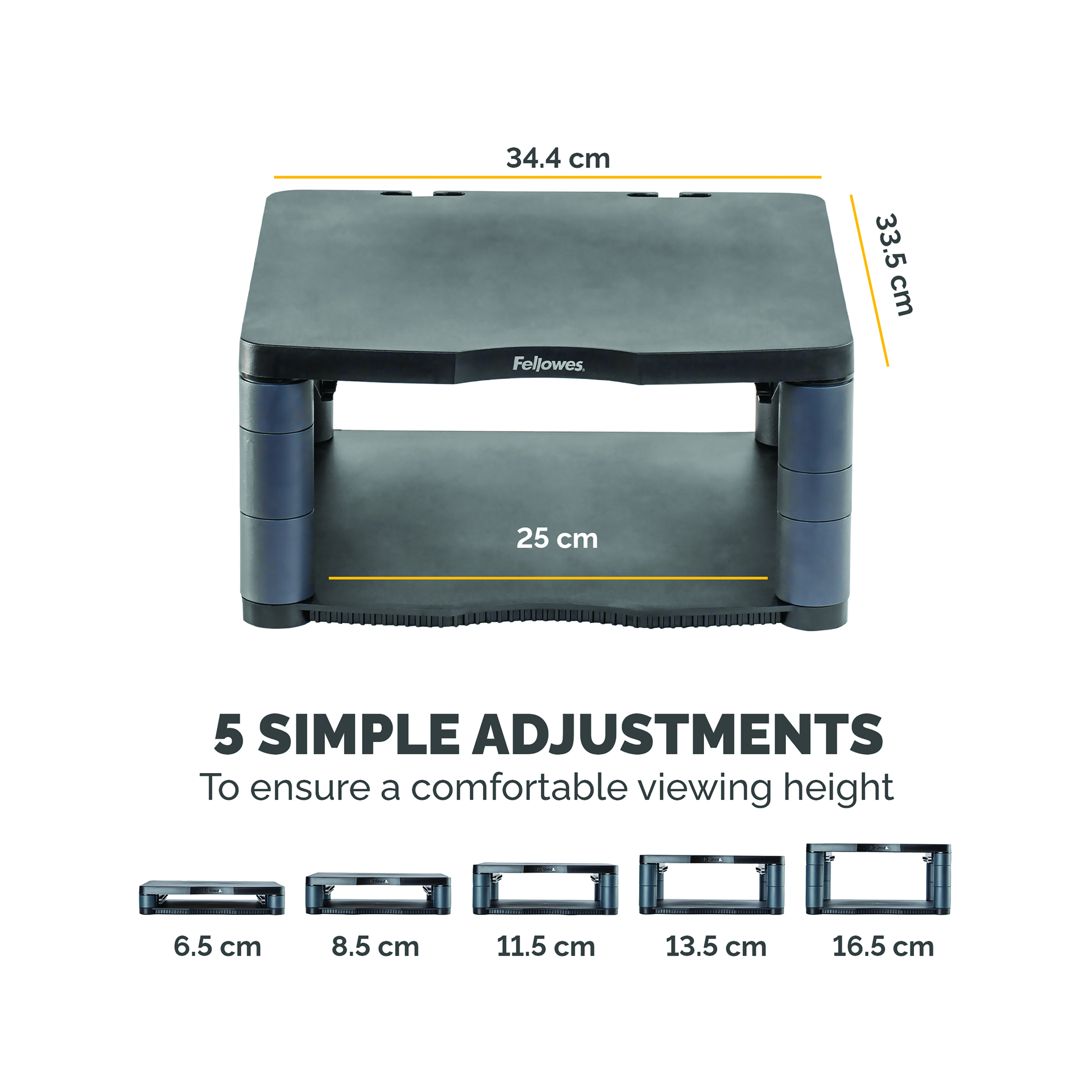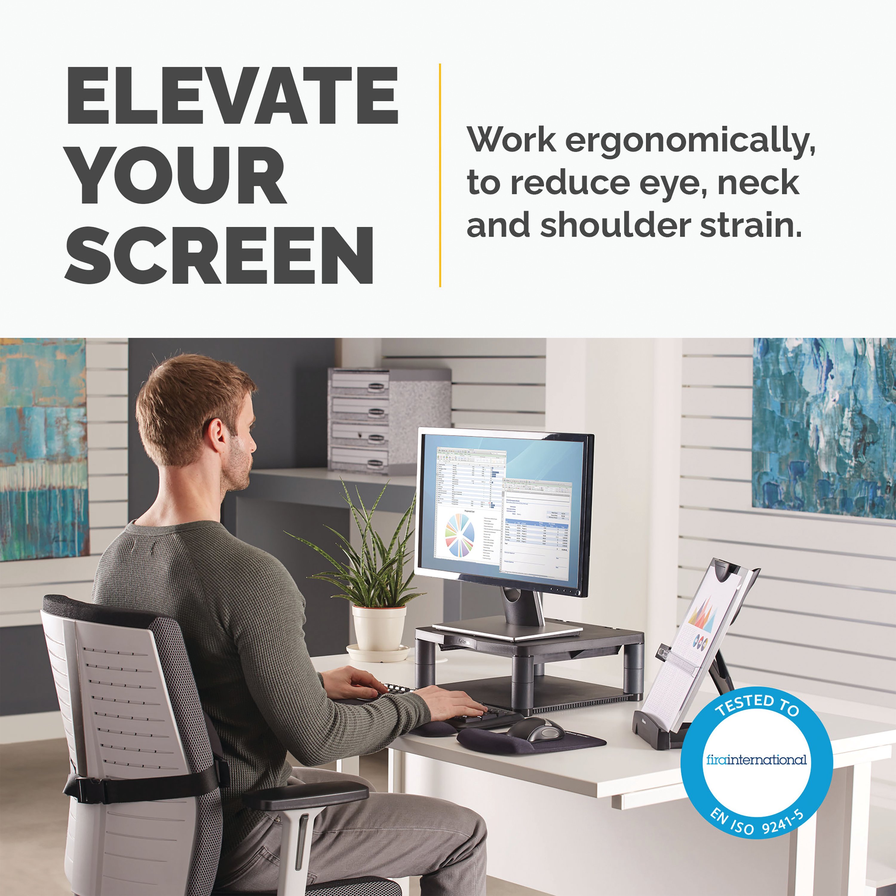 A few easy adjustments to your workstation can make a huge difference to your daily routine. Moving your head to view your screen or to read documents requires you to tilt and turn your neck and upper back. Positioning your screen incorrectly can put serious strain on your eyes, neck and shoulders which is why this Fellowes computer stand is a necessity for your workspace as it allows you to place your monitor at a more ergonomically-correct viewing position to suit you. This adjustable monitor stand can support up to a 21 inch CRT or TFT/LCD monitor or a maximum weight of 36kg, and features non skid foot rings, ensuring stability on any surface. Accommodate the ideal viewing angle that ideal suits your needs, the Standard computer stand features five height adjustable settings (65-165mm) allowing you to find a comfortable screen position accustomed to you. This monitor riser is accredited by FIRA International, an independent Ergonomic Accreditor.