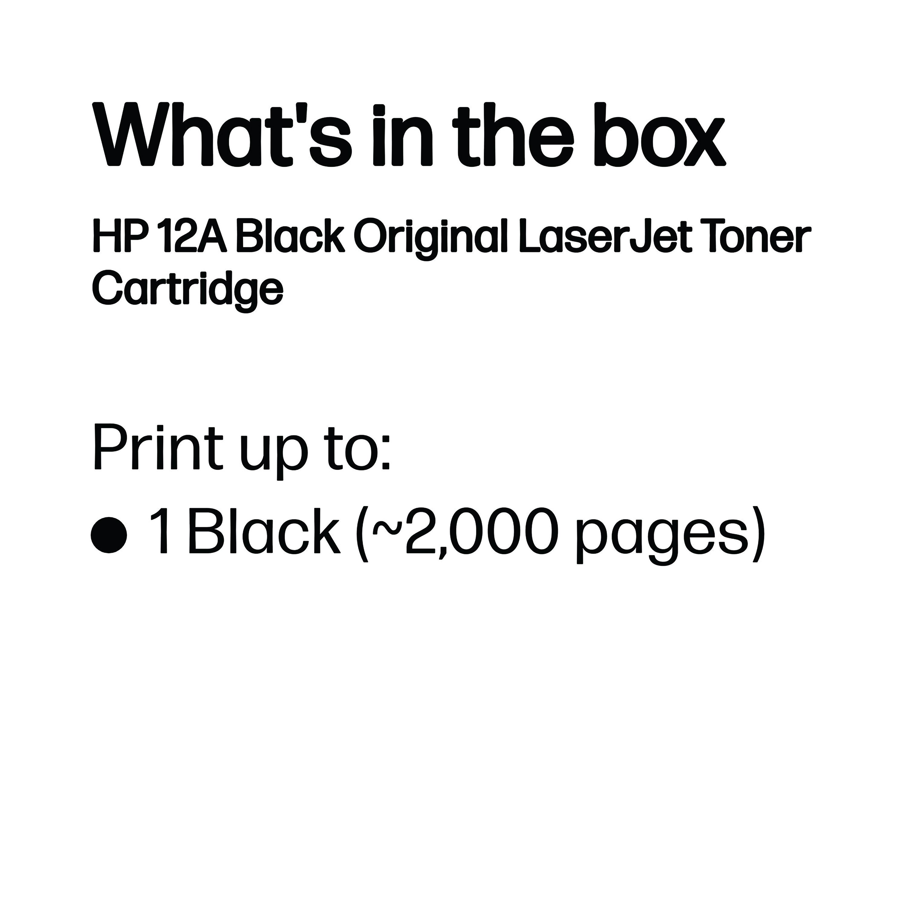 This HP 12A toner cartridge is for use with HP LaserJet 1010, 1012, 1015, 1018, 1020, 1022, 3050, 3052, 3055 and M1005 printers. The black toner cartridge has a print yield of up to 2,000 pages. This dual pack contains 2 black toner cartridges.