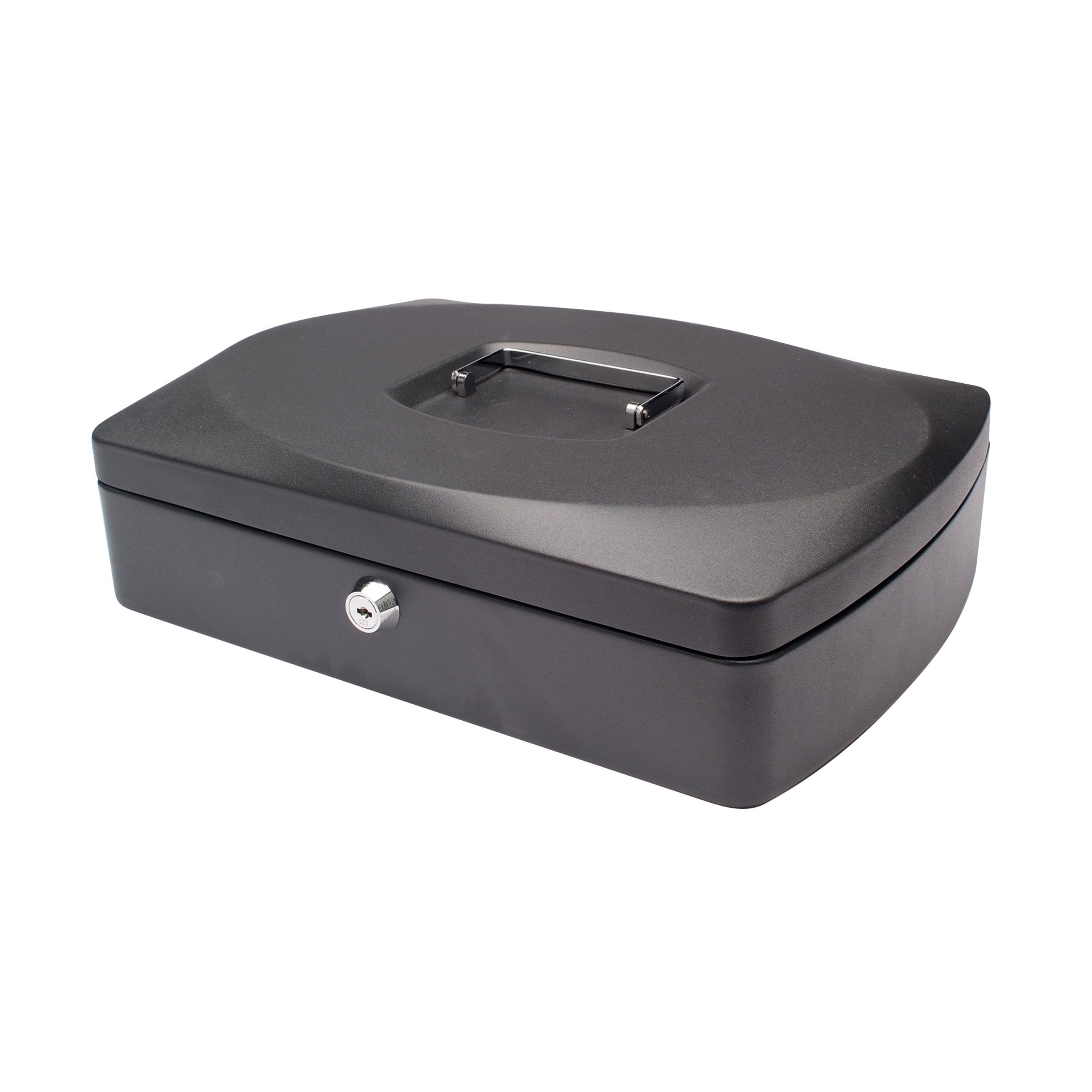 Store cash securely on site with this Q-Connect Cash Box, which is fully lockable and comes supplied with two keys for dual points of access. It offers portable money storage at outdoor retail operations or for transporting cash from one location to another. A removable cash tray has individual compartments for notes and change, leaving a large space underneath for receipts, vouchers and other valuable objects needing to be locked away.