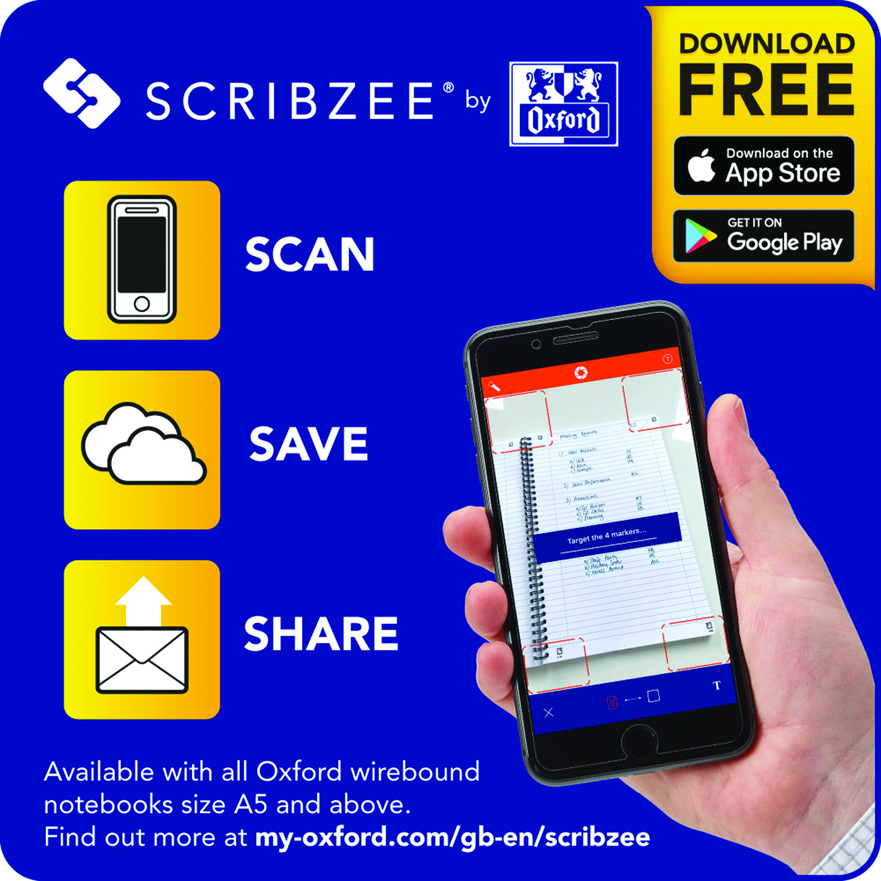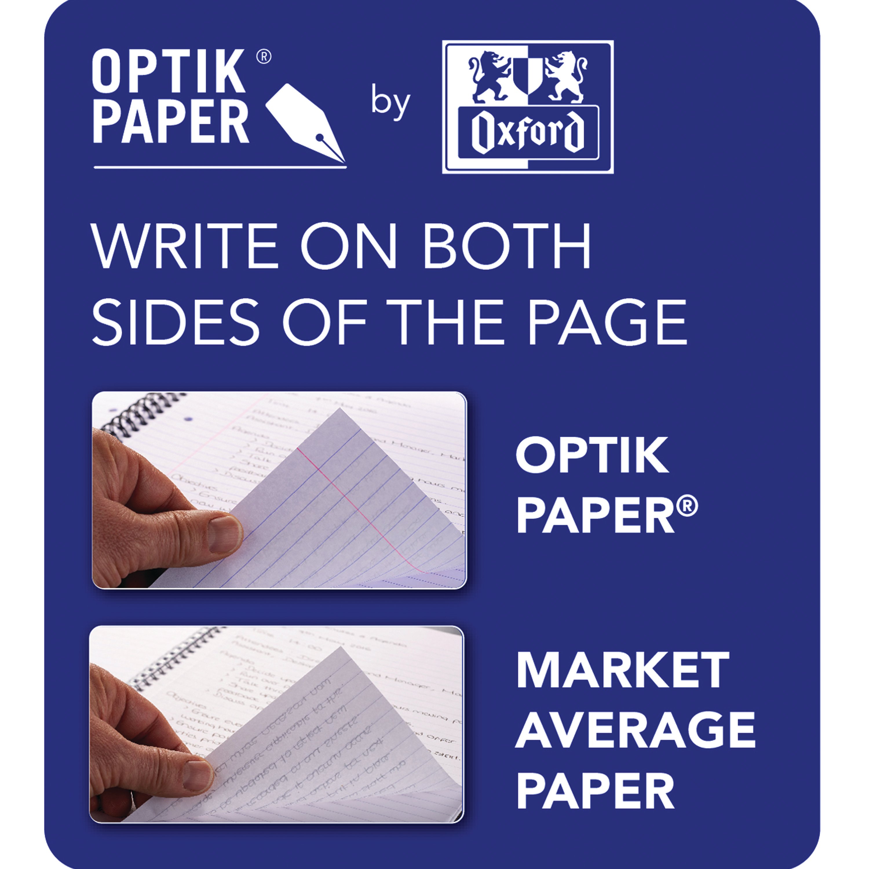 This Oxford Touch notebook contains 160 pages of high quality Optik paper, which is ruled with a margin for neat notes. The notebook also features a laminated, hardback cover with wire binding, which allows the notebook to lie flat. The pages are also 4-hole punched for filing in standard A4 ring binders and lever arch files, and Scribzee app compatible, allowing you to scan and share your notes. This pack contains 5 A4 notebooks in assorted neon colours (blue, orange, yellow, pink and green).