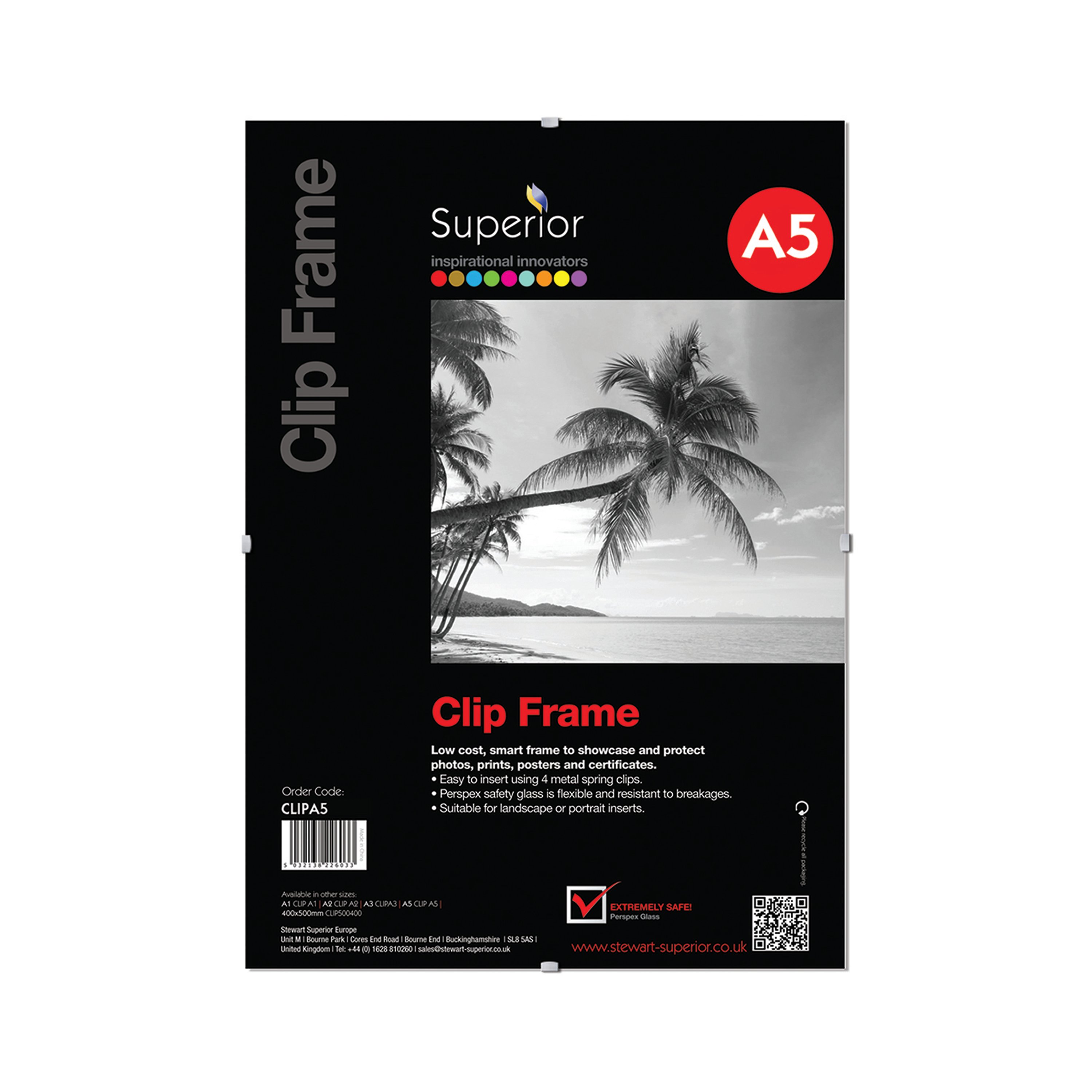 Made with a break resistant front, this Seco A5 Clip Frame is ideal for displaying photos, posters and certificates. Featuring discrete, metal clips to the edges, this frameless design holds contents in place, displaying them securely while preventing surface damage.